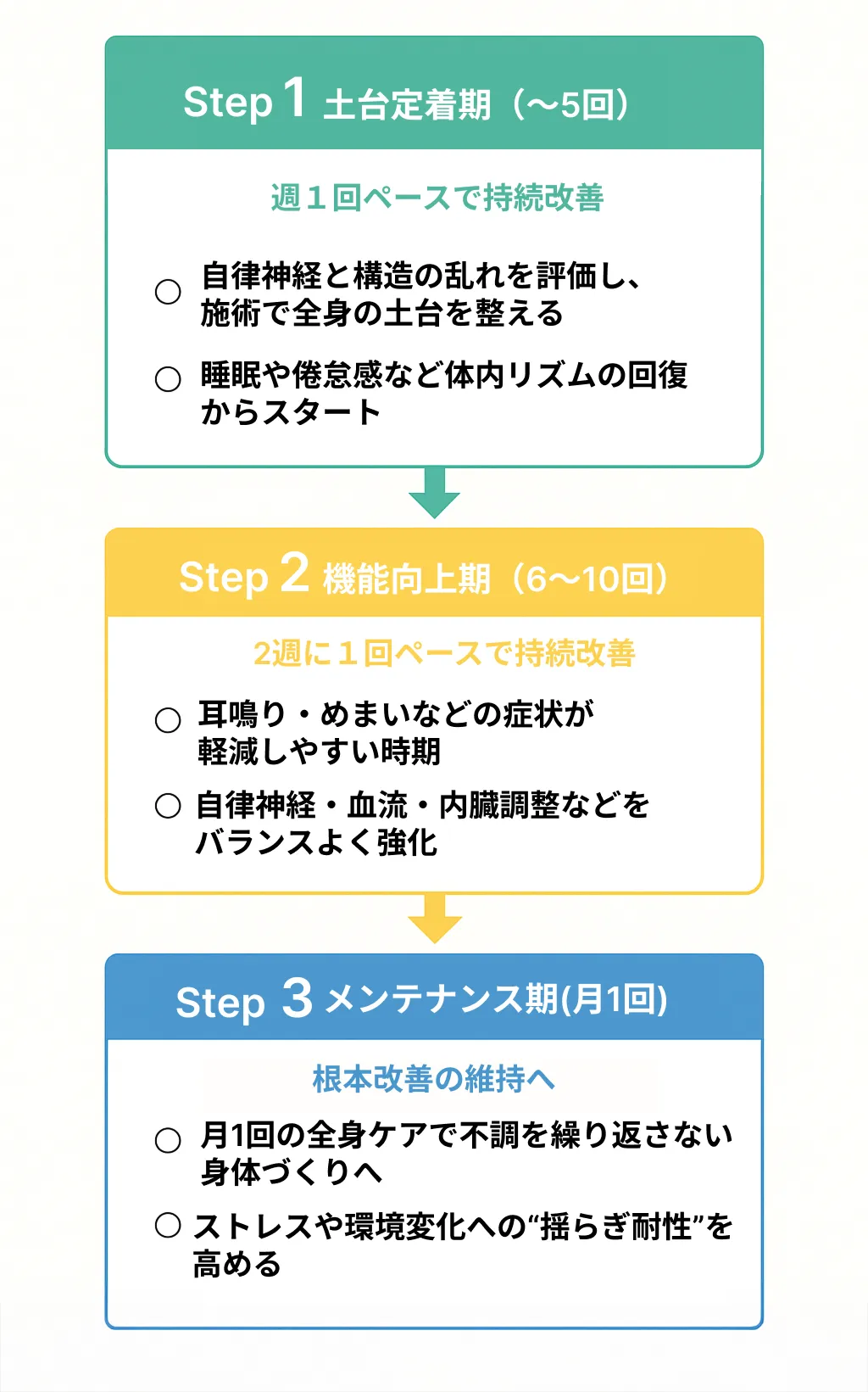 ていねいなカウンセリングと全身の調整を通じて、段階的に“根本改善”へと導きます。