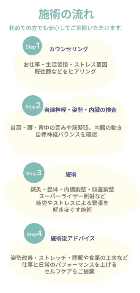 ストレスや緊張で乱れた自律神経のバランスを整えるために、鍼灸・整体・スーパーライザー照射などを組み合わせます。
