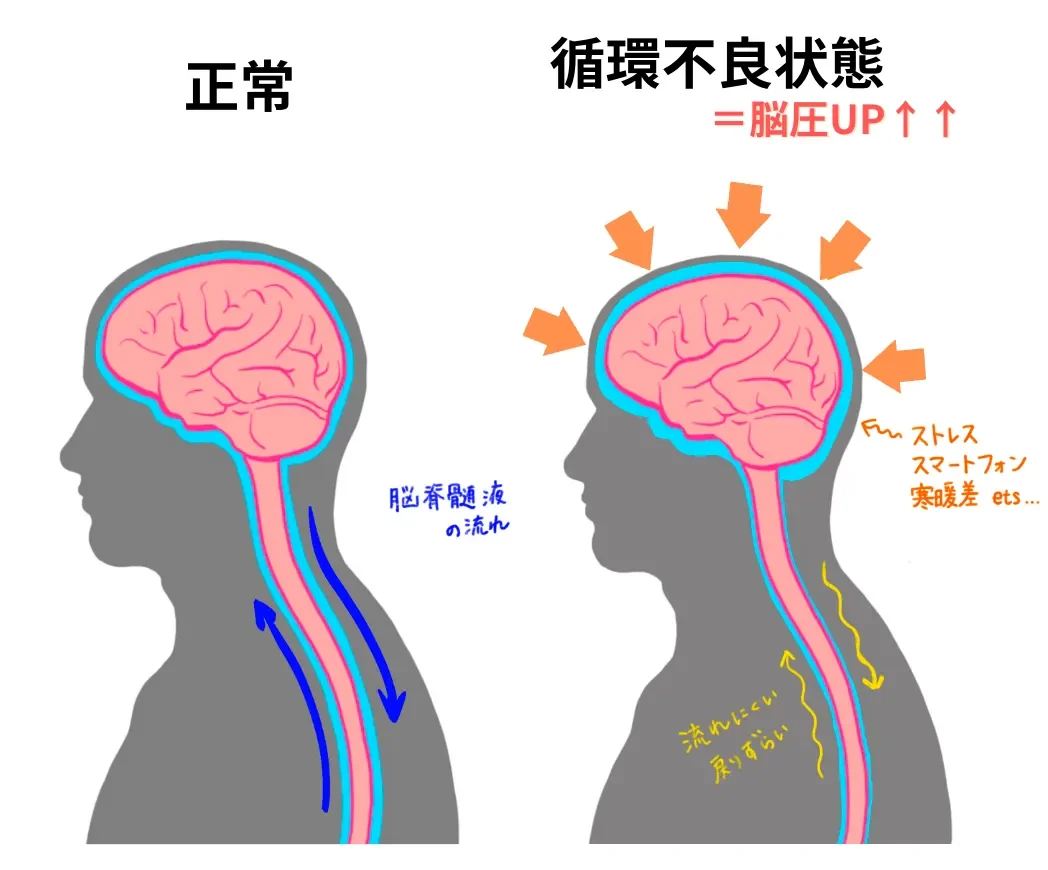 この流れが滞ると、脳の圧(脳圧)が上がりやすくなり、次のような不調が出やすくなります。