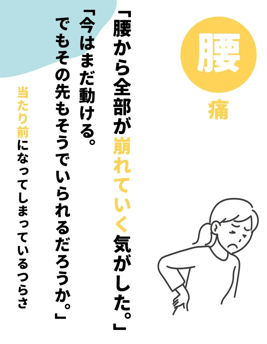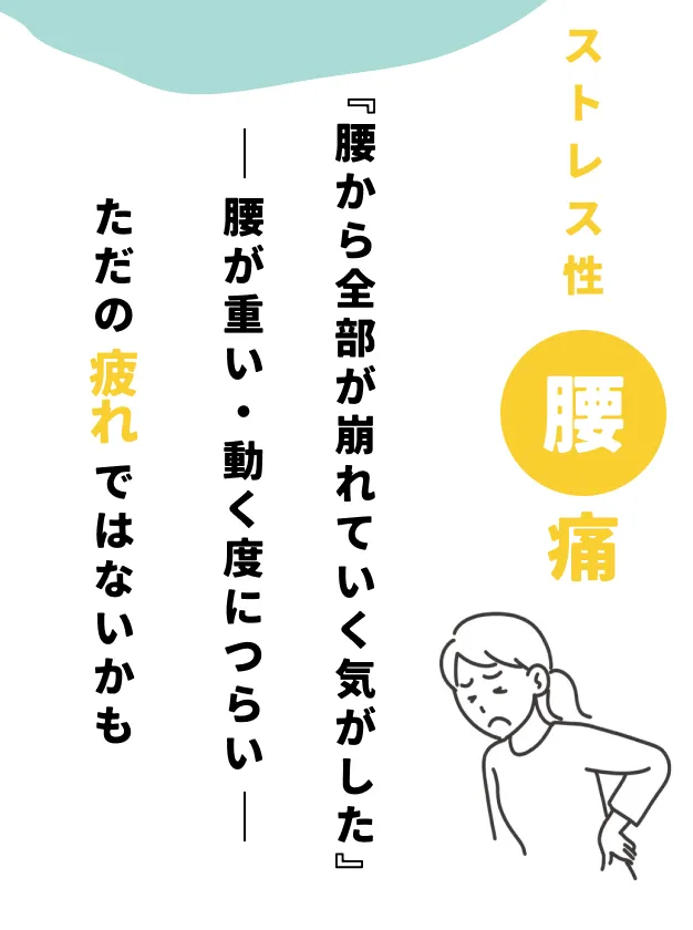 腰痛は原因が様々あるなかでもっとも慢性化しやすく、一見放置しがちな症状です。病院では検査で異常がないので「ストレスを減らしましょう」「運動をしましょう」など一般的なことを言われることも多いため、先の見えない状態が続くことに対して不安に思われるでしょう。
